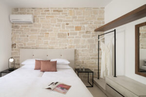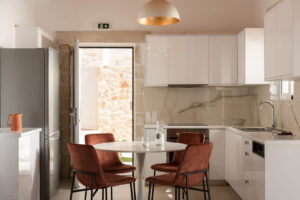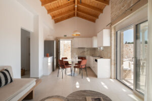 Ground Floor | Living Room & Lounge Area ( featuring a 55’ smart TV) • Dining area • Fully Equipped Kitchen • Double bedroom with Queen Size bed (1,60×2,00), En-Suite bathroom with walk in shower, direct access to the terrace • Twin Bedroom with two single beds (0,90×2,00) joined to form a King Size bed, En-Suite bathroom with walk in shower, direct access to the terrace.