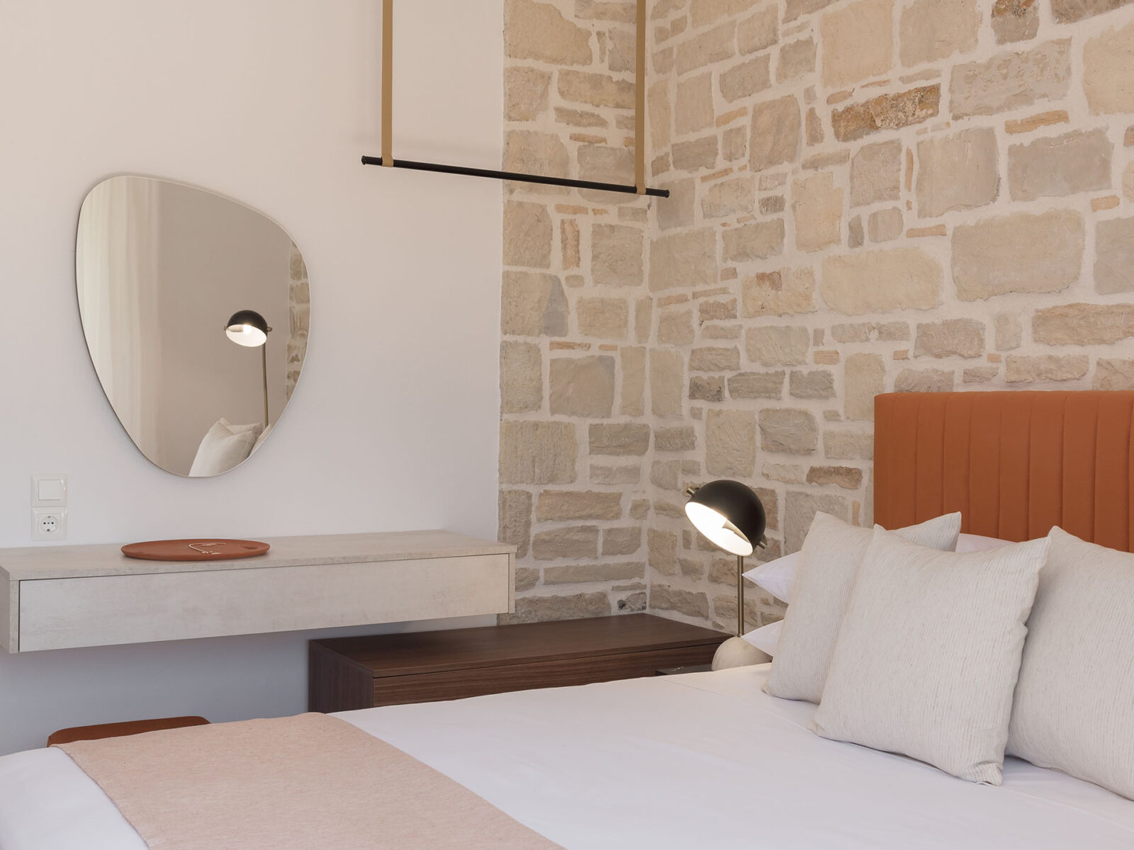 Ground Floor | Living Room & Lounge Area ( featuring a 55’ smart TV) • Dining area • Fully Equipped Kitchen • Double bedroom with Queen Size bed (1,60×2,00), En-Suite bathroom with walk in shower, direct access to the terrace • Twin Bedroom with two single beds (0,90×2,00) joined to form a King Size bed, En-Suite bathroom with walk in shower, direct access to the terrace.